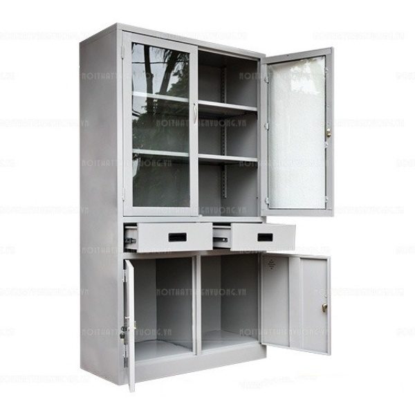 Tủ sắt văn phòng cánh kính ngăn kéo QP-18 được sử dụng để đựng đồ cá nhân, hồ sơ, tài liệu, tại các văn phòng, cơ quan, nhà hàng, xí nghiệp,…Chiếc tủ được làm bằng thép cao cấp phun sơn tĩnh điện chống trầy xước. Tủ có khoang ngăn kính bên trên, có 2 đợt chia làm khoang làm 3 ngăn tiện lợi, 2 ngăn kéo ở giữa, khoang cánh kính bên dưới